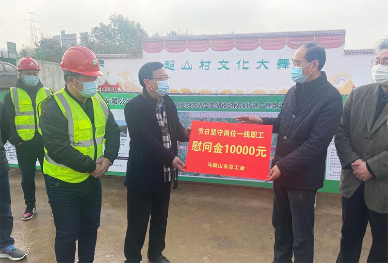 1月28日上午,马鞍山市人大常委会党组成员、一级巡视员、市总工会主席杨勇义一行深入PA集团官网承建的宁芜改扩建黄梅山保通线项目部,慰问一线员工,值此新春来临之际,把党和政府及工会组织的温暖送到奋战一线的员工手中。