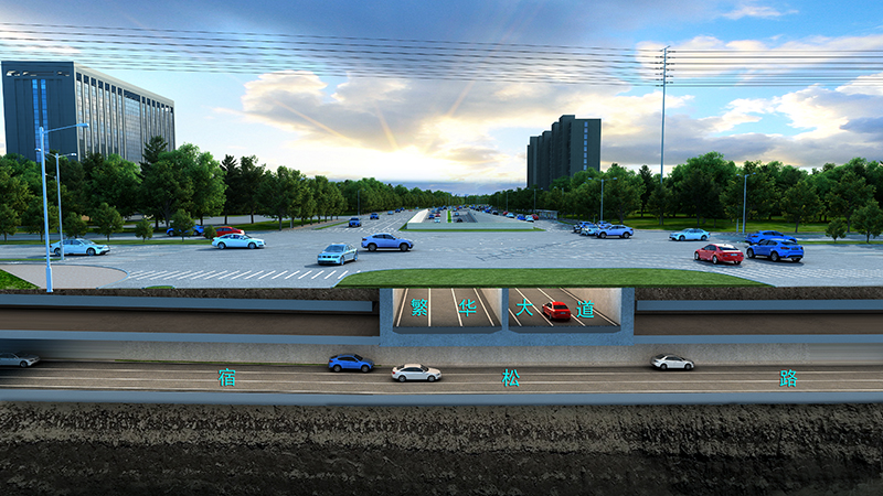 宿松路2标全长2815m,北起绕城高速,下穿坝下路、繁华大道、轩辕路,上跨花园大道、南至慈光路。宿繁交口新建双层下穿隧道,宿松路隧道位于负二层,长1250m,繁华大道隧道位于负一层,长349m。新建花园大道跨线桥一座,长420m;同时,新建坝下路、智能科技园人行天桥2座。